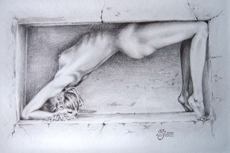 Monogrammiert SJ, Bleistiftzeichnung eines zeitgenössischen Künstlers (Juri Schupenjuk), mit interessantem, comichaft-düsterem Blickwinkel.
