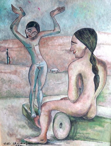 Schönes, exotisch und leicht androgyn wirkendes Bild eines auf Baumstaemmen spielenden Pärchens. Victor Chandra Rajan (*22. September 1942 in Nellur Jaffina auf Ceylon, dem heutigen Sri Lanka), studierte in der Hauptstadt Colombo 5 Jahre an der Kunsthochschule und beendete seine Studienzeit mit dem Diplom. Im Anschluß daran war er mehr als 2 Jahre an der Hochschule für Architektur immatrikuliert, bevor er 1974 unter anderem wegen seines katholischen/anglikanischen Glaubens aus seiner Heimat vertrieben wurde und nach Deutschland kam. Hier studierte er 2 Jahre in Hohenstein das Fach Bekleidungstechnik und arbeitete seitdem als freier Künstler. Victor Chandra Rajan drückt in seinen Bildern die tiefe Sehnsucht nach seiner verlorenen Heimat Ceylon aus. Die einmalig schönen Sonnenuntergänge in Verbindung mit den ursprünglichen Landschaften Ceylons bringt er sehr phantasievoll zum Ausdruck. Die häufigsten Motive seiner farbenfrohen Bilder zeigen die tiefe Harmonie zwischen Mensch, Tier und Natur eingebunden in ein lebendiges Dorfleben.