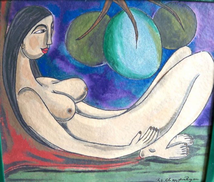 Exotisch-schöner Akt einer unter einem Baum Liegenden. Die Blätter sehen aus wie pralle Feigen und so könnte der Garten Eden gemeint sein. Victor Chandra Rajan (*22. September 1942 in Nellur Jaffina auf Ceylon, dem heutigen Sri Lanka), studierte in der Hauptstadt Colombo 5 Jahre an der Kunsthochschule und beendete seine Studienzeit mit dem Diplom. Im Anschluß daran war er mehr als 2 Jahre an der Hochschule für Architektur immatrikuliert, bevor er 1974 unter anderem wegen seines katholischen/anglikanischen Glaubens aus seiner Heimat vertrieben wurde und nach Deutschland kam. Hier studierte er 2 Jahre in Hohenstein das Fach Bekleidungstechnik und arbeitete seitdem als freier Künstler. Victor Chandra Rajan drückt in seinen Bildern die tiefe Sehnsucht nach seiner verlorenen Heimat Ceylon aus. Die einmalig schönen Sonnenuntergänge in Verbindung mit den ursprünglichen Landschaften Ceylons bringt er sehr phantasievoll zum Ausdruck. Die häufigsten Motive seiner farbenfrohen Bilder zeigen die tiefe Harmonie zwischen Mensch, Tier und Natur eingebunden in ein lebendiges Dorfleben. Öl auf Hartfaser im grünen Holzrahmen.
