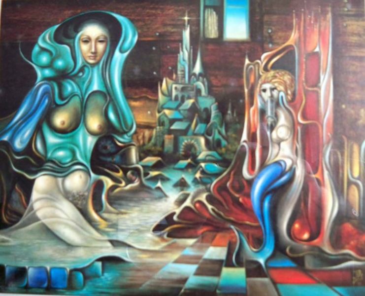 Surrealistischer Künstler mit der phantastischen Lithografie "Zwei Meerjungfrauen". Im Druck monogrammiert und datiert, unter dem Bild unleserlich beziffert und signiert. Hinter Glas im weißen Holzrahmen.