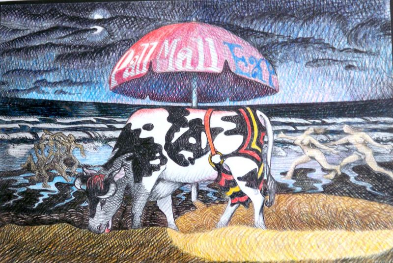 Merkwürdige, traumartige, filigran schraffierte Buntstift-Zeichnung, zwar betitelt, aber nicht signiert. Links unten betitelt mit "Anarchie der Seele" oder "Die blöde Kuh beim Bade", rechts unten bezeichnet mit "Lebendig Legeort" und datiert "Texel, August 1982".