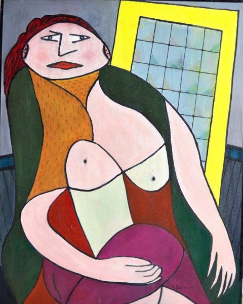 Gerard Diepeveen ist ein Maler aus Enschede. Hier ein schöner, farbiger, abstrakt-kubistischer Akt, der eine typische holländische Prostituierte in einem Fenster darstellen könnte (bspw. durch die eine verhüllte und die aus dem Kleid hervor quellende Brust.
