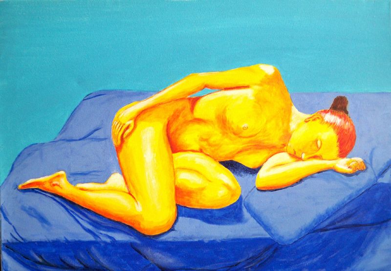 Farbenfroher, dekorativer Akt einer nackten Schlafenden, gold-farben auf blauem Hintergrund, gemalt von einem unbekannten zeitgenössischen Künstler
