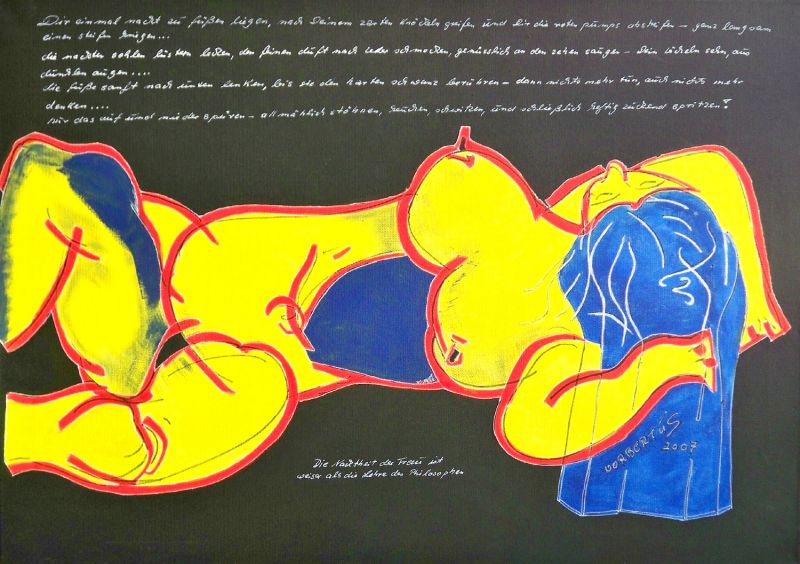 Norbert Rolle (Künstlerkollege von u.a. Peter Robert Keil, lebt und arbeitet in Schleswig Holstein), signiert 'norbertus' - "Die Nacktheit der Frau (ist weiser als die Lehre des Philosophen)". Farbenfroher liegender Akt in expressionistischer Malweise mit pornografischem Gedicht angereichert.