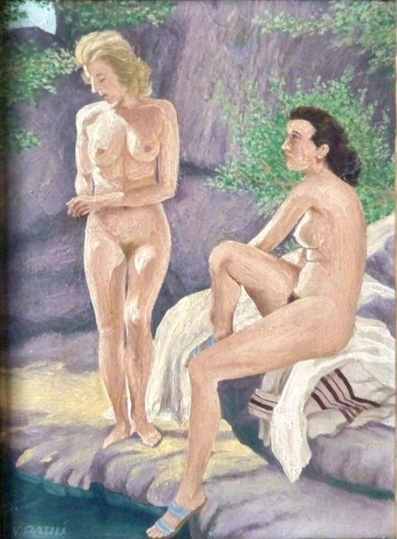 Aktgemälde zweier Frauen beim Bade am See, in gekonnter, etwas pastoser Malweise. Signiert und datiert, Datierung jedoch durch Rahmung verdeckt, vielleicht 1949?