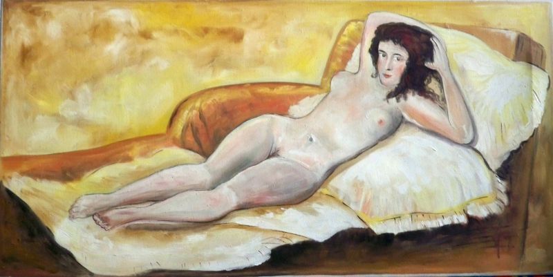 Gemalt nach dem Klassiker der erotischen Kunst: Francisco de Goya - "La maja desnuda" von 1800 (hängt in der Größe 97 x 190 cm im Museo del Prado). Hier eine farblich differente, hellere Version aus einem Nachlass. Tempera auf Leinwand auf Keilrahmen, monogrammiert V.T., Entstehungs-Zeitraum wahrscheinlich DDR ca. 1965-1975, vermutlich Raum Mansfeld /Südharz.