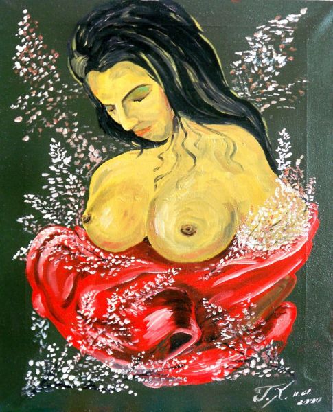 Üppiger, etwas folkloristisch wirkender Halbakt einer schwarzhaarigen Schönheit.