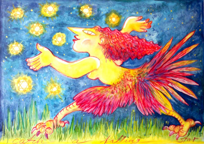 Fröhliche, Karikatur artige Lithografie einer rothaarigen Hahnenfrau, die Münzen bzw. Sterne jagt, von Katrin Schober. Signiert und nummeriert 571 von 1000.