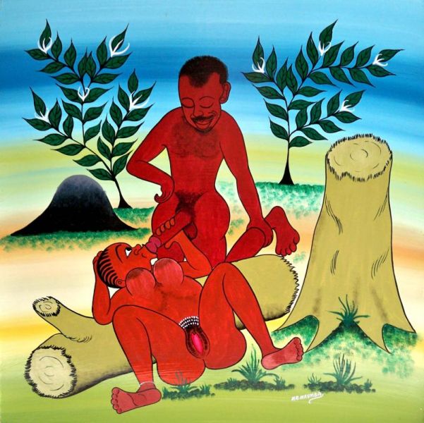 Steven Mkumba - Erotic Tinga Tinga. Dies ist ein typisches Gemälde der Tinga Tinga Kunst aus Tanszania, benannt nach ihrem Begründer "Tingatinga". Diese Kunst ist in Tanszania quasi Staatskunst und wird öffentlich gefördert. Normalerweise sind die gemalten Motive aus der Tier- und Pflanzenwelt Tanszanias, seltener sind Szenen mit Menschen zu sehen. Steven Mkumba weicht von den herkömmlichen Motiven ab und malt auch provokative und kritische Themen. Von der offiziellen Tinga-Tinga-Webseite: