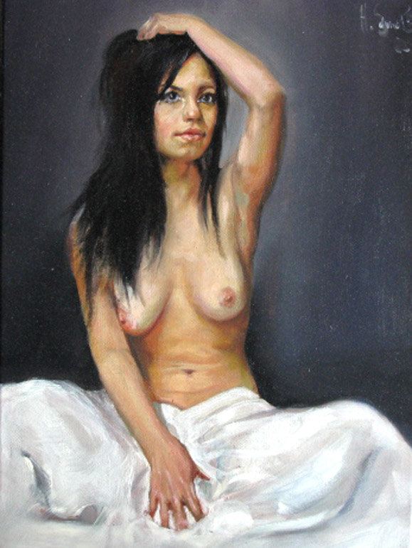 Schönes, realistisch ausgeführtes Aktporträt eines sitzenden Halbakts mit erhobenem, linken Arm.
