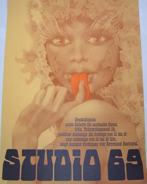 Offset Plakatdruck. 1969. Plakat zur Eröffnung des legendären Studio 69 mit Erotischer Kunst, vor allem Fotografie und Grafik, in Köln. Bertrand (1909 - 1989) ist verzeichnet u.a. bei artprice.