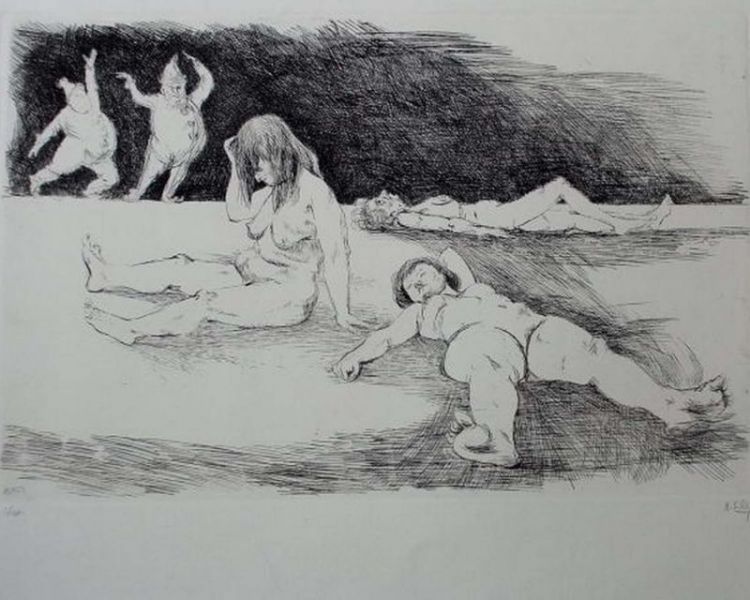 Radierung auf Büttenpapier. 1963. Loses Blatt. Erotische Radierung mit drei ruhenden nackten Frauen und zwei Seppl-haften Männern (besoffen?) im Hintergrund