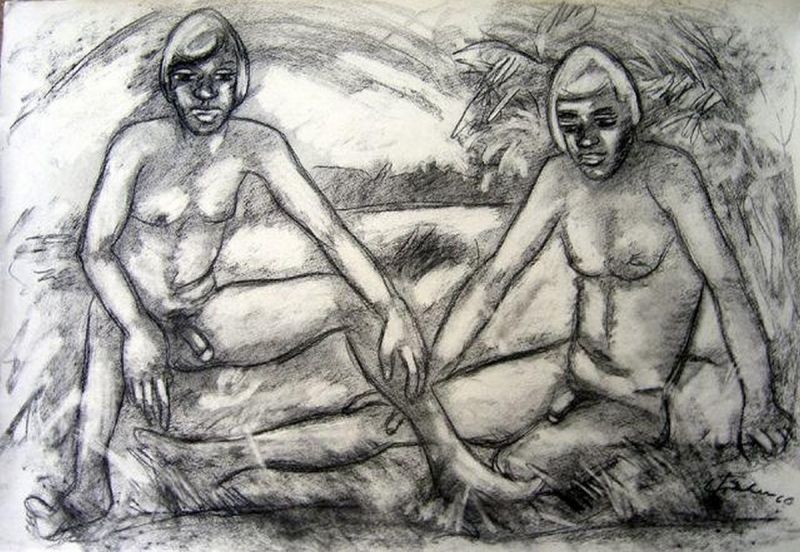 Kohlezeichnung auf Papier, 1960. Loses Blatt. Erotische Szene zweier nackt am Wegesrand lagernder Knaben.