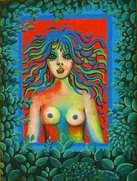 Nicole de Rigné - Halbakt Psychedelisch von 1974. Schöner, lebhaft farbiger, psychedelisch anmutender Halbakt, gerahmt in schönem Holzrahmen mit Leiste hinter dunkelgrünem, samtenen Passepartout.