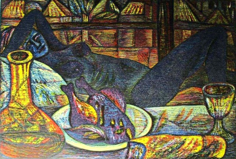 Fekete, Esteban (geb. 1924), 6-Farben-Holzschnitt: "Liegender Akt mit Stillleben", signiert u. -limitiert: 6.604/10.000.