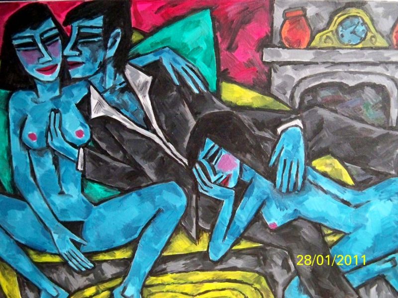 Freches, peppig-poppiges Gemälde einer bohemianischen Liebe zu dritt. Öl auf Leinwand von Berutscha (Gurami Hagemann *1945 Tiblissi/Georgien, im Alter von 15 Jahren erhielt er das Diplom für Malerei, 1965 - 1971 Kunstakademie Tiblissi, 1993 politisches Asyl in Schleswig-Holstein und deutsche Staatsbürgerschaft, + 2013); verso signiert und datiert "Berutscha 67".