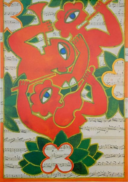 Offsetlithografie von Herbert Schneider (*1924 Griesbach - 1983 Hintertal/Österreich). Schneider war ein Schüler von Willi Baumeister an der Stuttgarter Kunstakademie. Seine Werke finden sich außer in Privatsammlungen auch in den städt. Galerien München bzw. Bochum, der Albertina Wien, dem "Museum of Art", Rochester, N.Y. und anderen.