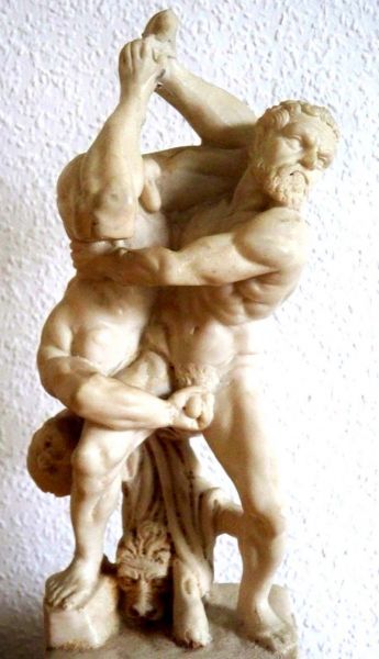 Witzige Skulptur im klassizistischen Stil, die wohl einen Ringkampf zeigt, bei dem die Kämpfer (deren Kraft durch einen Löwenkopf symbolisiert wird), sich beherzt an ihre Geschlechtsteile greifen.