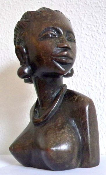 Erotische, schöne Holzbüste des Halbaktes einer Afrikanerin, toll gearbeitet, mit hübschem Gesicht, typischem Schmuck und Dreadlock-Frisur.