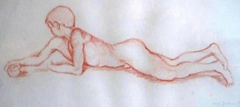 Rötelzeichnung eines nackten, liegenden Knaben auf Büttenpapier, hinter Glas gerahmt. Leider sehr undeutlich signiert und datiert 1929.
