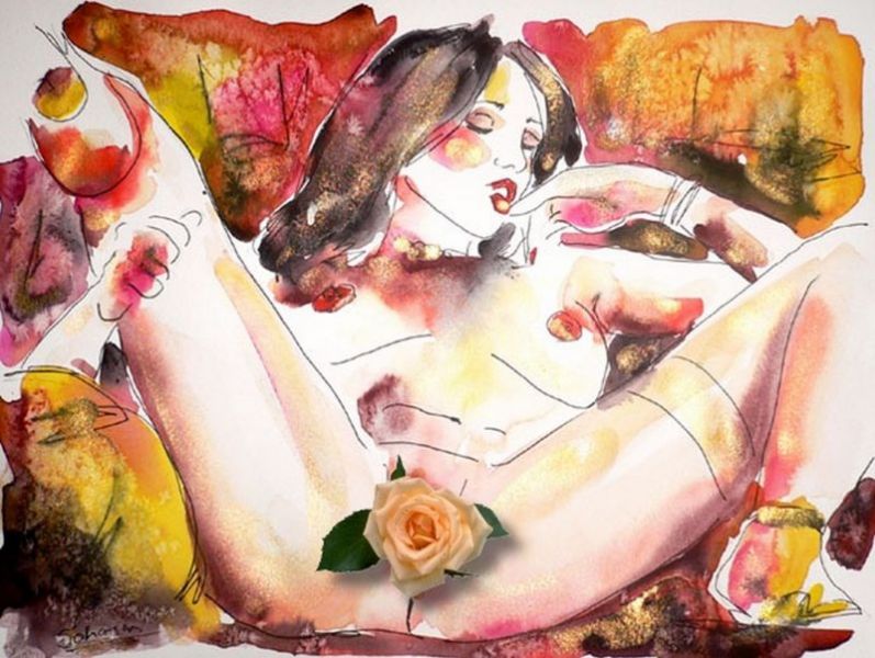 Erotisches, freches und farbenfrohes Aquarell einer sich hingebenden Muse.