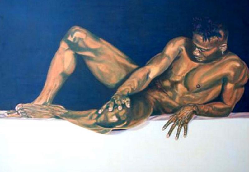 Großformatige Arbeit mit einem seitlich aufgestützt ruhenden, männlichen Akt eines schwarzen Mannes. Öl auf Leinwand, auf Keilrahmen gespannt.