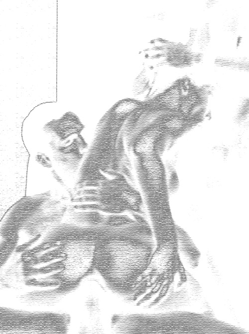 Ein Ehepaar lädt einen fremden Mann ein, die Frau im Beisein ihres Mannes zu beglücken. Der Ehemann schaut zu, bleibt aber nicht passiv, sondern beteiligt sich. Es ist eine gleichberechtigte Vereinbarung zwischen dem Mann und der Frau - bei vielen Männern eine beliebte Fantasie, wenn ihre Frau von anderen gekickt wird. Sie wiederum befriedigt es, vor ihrem Mann ungehemmt zu agieren. Sie wünsche sich jetzt immer mehr davon, das wisse ihr Mann, schrieb mir die Frau eines Paares. Mit meiner Technik überführe ich diese Spielart der Erotik, die das Paar als Intensivierung seiner Ehe empfindet, in den künstlerischen Kontext."