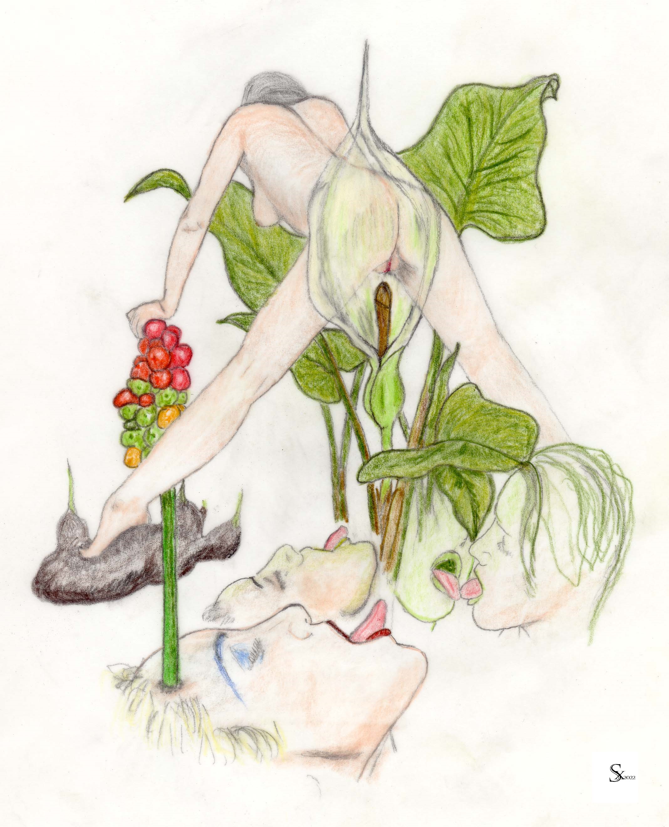 Samenkörner, die aufplatzen und deren fruchtende Keimblätter eine Vagina bildeten, aus der wiederum neues Leben spross. Beeren, Nüsse, Früchte einer Eiche, im Regen glänzende Fruchtkörper wie die vom Liebestau benetzte Eichel eines erigierten Schwanzes. Die Blüte des Aronstabes, die in mir das Verlangen nach Kopulation, nach wildem Sex, auslöste. Bilder, welche weitere Bilder in mir entstehen ließen, perpetuierend...