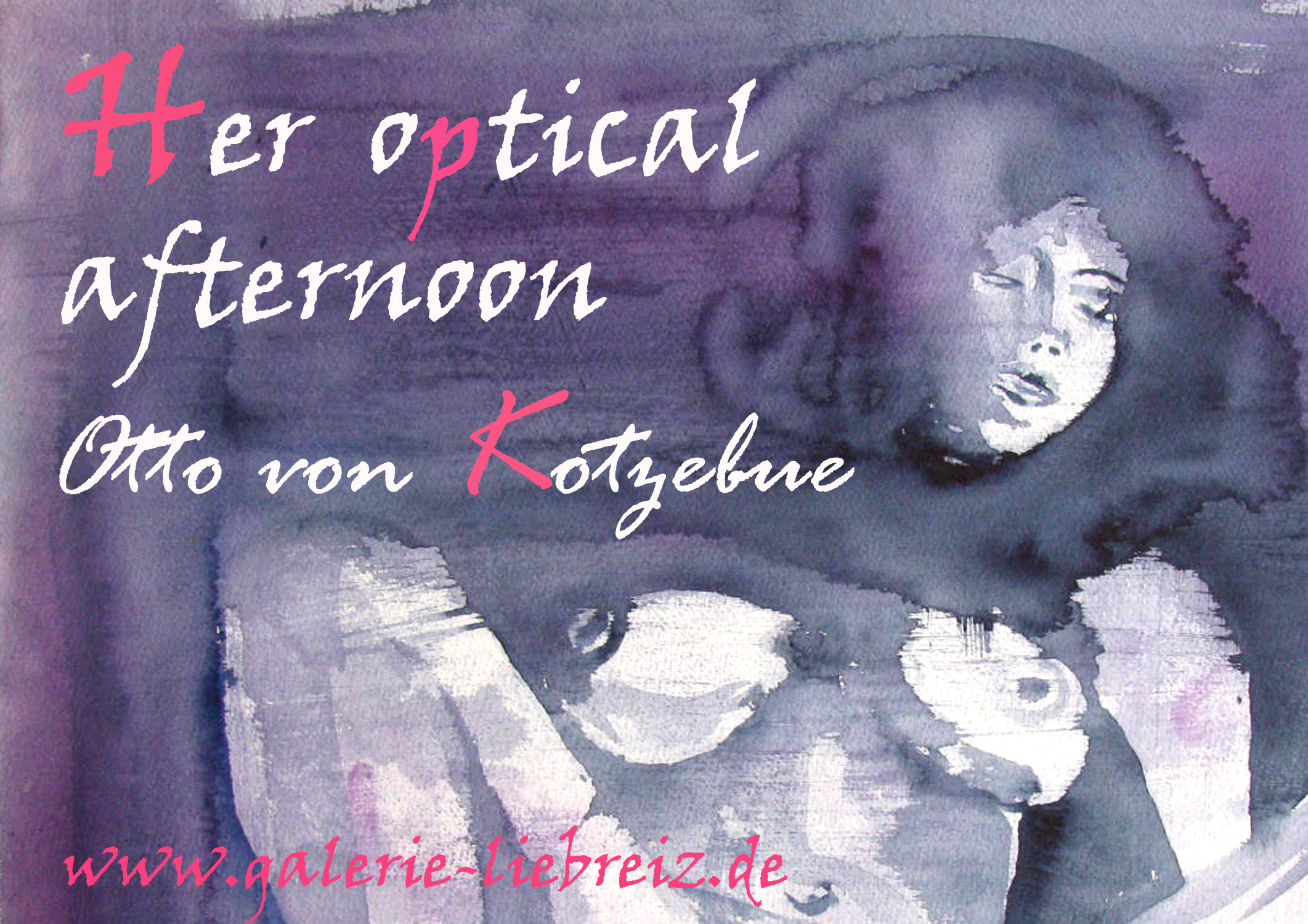 Ihr optischer Nachmittag: Sich zeigen, durchblicken, erkunden lassen. So breitet sie ihren Körper vor den Augen des Künstlers aus, spürt freudige Erregung aufkeimen und erstarrt in der Pose der Empfangenden. Otto von Kotzebue skizziert und zelebriert die Eindrücke ihrer Hingabe und Zeigelust. Mit liebevollen Tupfern und Streicheleien seines virtuos geführten Pinsels bemalt er ebenso ihre Phantasie mit der Erinnerung an den wie beim Sexualakt einzigartigen Moment der Aktmalerei.